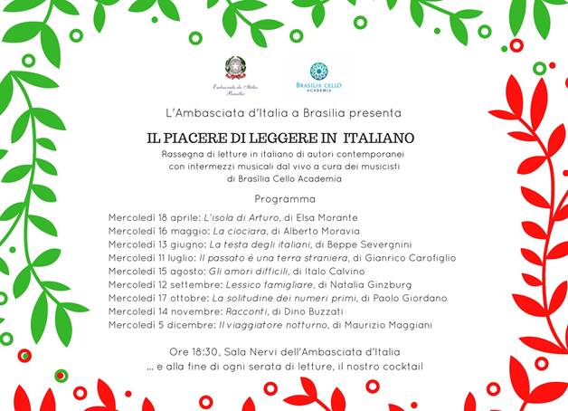 As leituras serão em italiano. Os músicos de Brasília Cello Academia proporão interlúdios musicais ao vivo. A entrada é franca, sujeita a lotação.