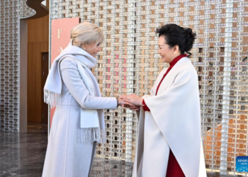 Peng Liyuan, esposa do presidente chinês, Xi Jinping, e Brigitte Macron, esposa do presidente francês, Emmanuel Macron, visitaram o Teatro ...